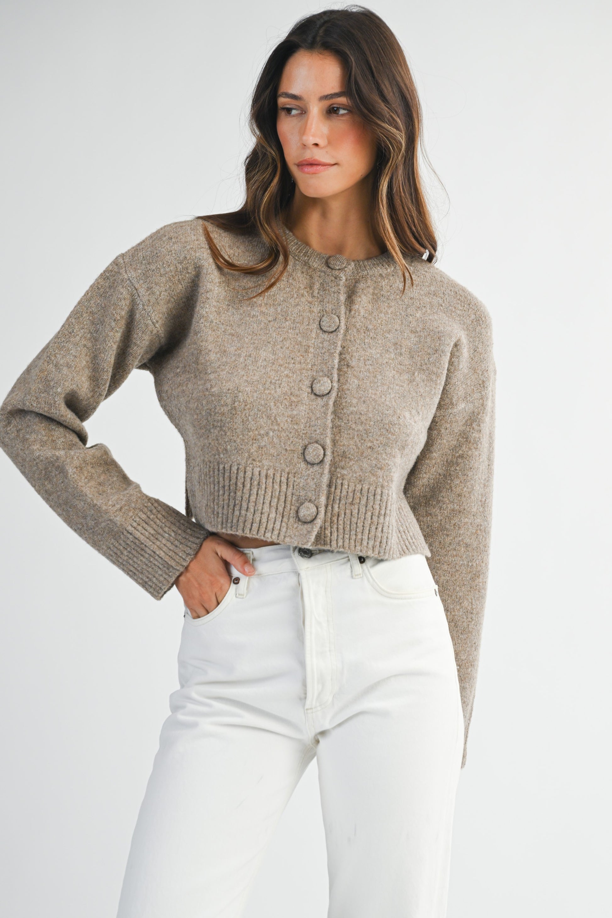 The Mocha Knit Crop Cardigan is a timeless layer with a modern cropped silhouette. Crafted in a soft, stretchy knit, it features a round neckline, long sleeves, and button-down front for effortless styling. Subtle side slits add comfort and movement, while the neutral mocha tone makes it an easy match with everything from denim to skirts.